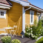Sommerhytta 2025: Gult lag i lysegul hytte. Fargen som er brukt utendørs er DRYGOLIN Power Clean 12136 Gentle Yellow. Kjæresteparet…