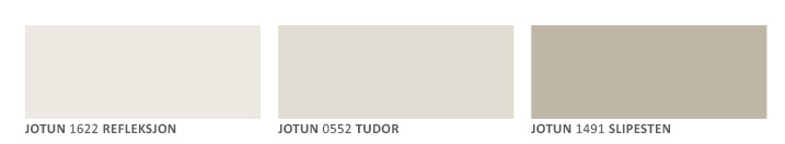 Hovedfarge: Jotun 1001 Egghvit, detaljer: Jotun 1391 Lys Antikkgrå eller 1973 Antikkgrå, mur: Jotun Drytech Murmaling 11129 Smokey Grey.