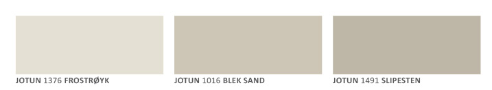 Hovedfarge: Jotun 1376 Frostrøyk, detaljer: Jotun 1016 Blek Sand eller 1283 Lys Grå Umbra, mur: Jotun Drytech Murmaling 1491 Slipesten.