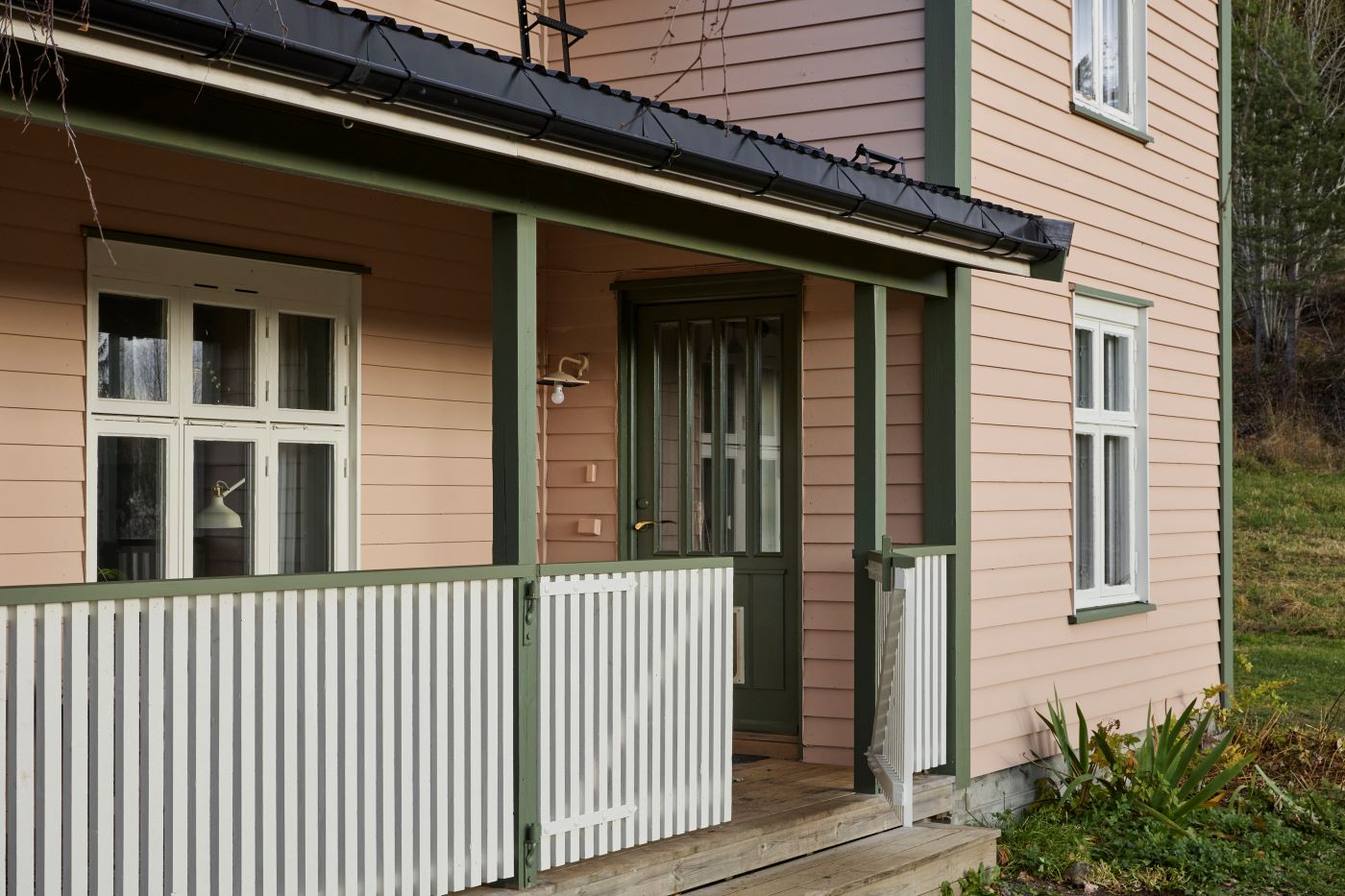 Velkommen inn! Huset er malt i Jotun-fargen 0239 Mellomrosa, den grønne døra i 8413 Herregårdsgrønn, og taket i 0731 Demihvit.