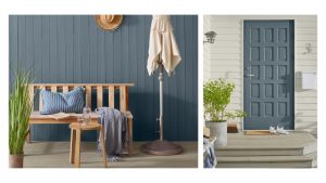 Venstre: Vegg Jotun 4252 Kjønnrøk Dempet, terrasse Trebitt 90029 Naturlig Sølvgrå. Høyre: Dør Jotun 5445 Delicate Blue, vegg Jotun 1274 Dus, terrasse Trebitt 90029 Naturlig Sølvgrå.