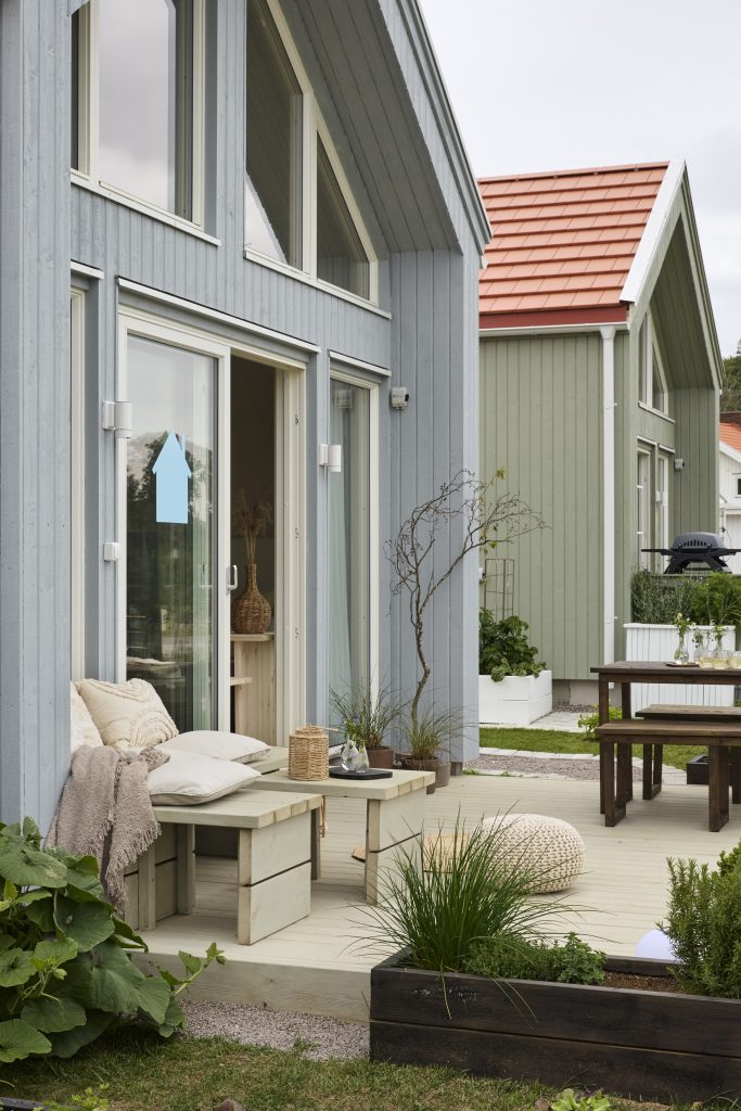 Markterrassen og de selvbygde møblene er beiset med TREBITT Terrassebeis 9072 Naturgrå. Blomsterkasse: TREBITT Terrassebeis 90002 Gråsvart.