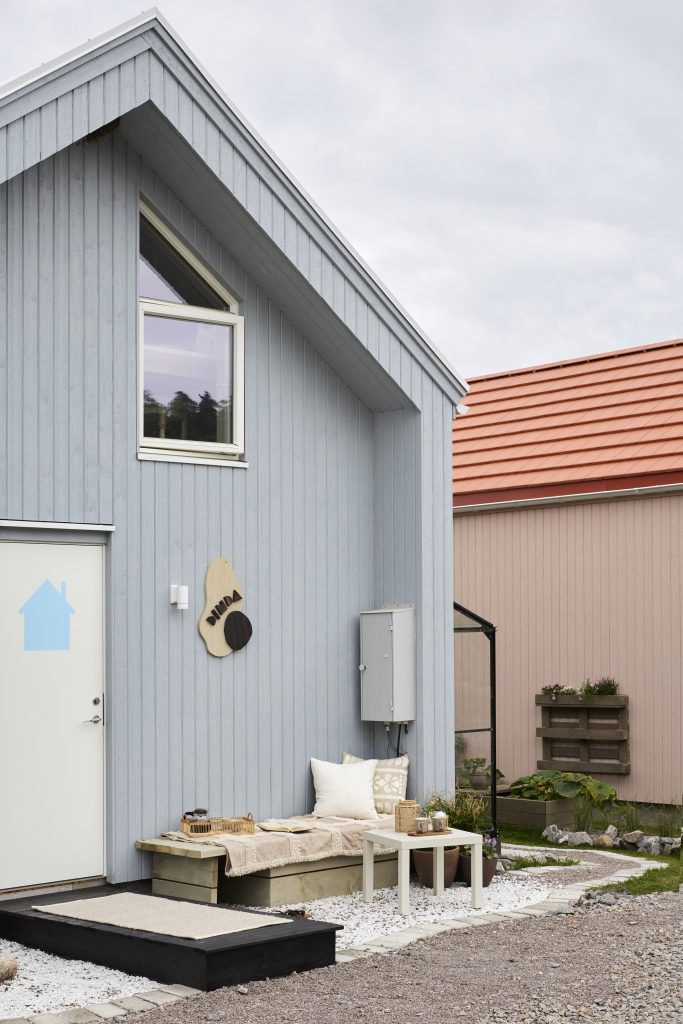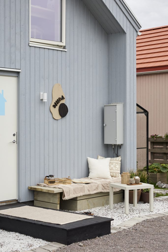 Til det janpansk-inspirerte inngangspartiet laget jentene en liten platting; en visuell brygge som leder veien inn til hytta. Den er beiset med TREBITT Terrassebeis 90002 Gråsvart. Benken i inngangspartiet er beiset med TREBITT Terrassebeis 9072 Naturgrå.