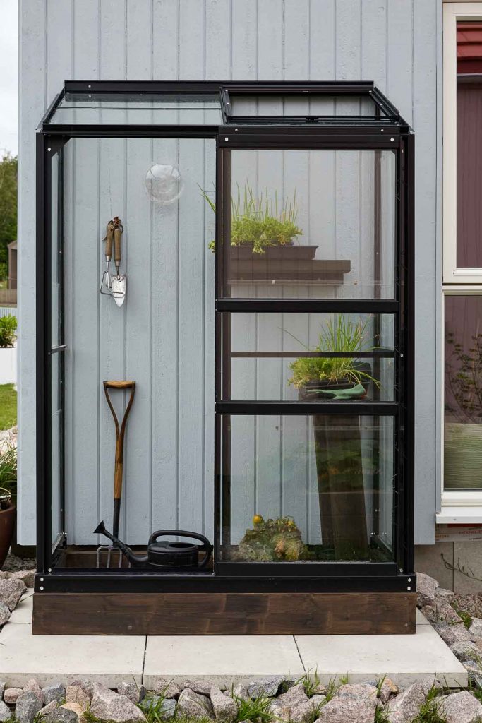 Blomsterkassen og leveggen er beiset med TREBITT Terrassebeis 90002 Gråsvart.