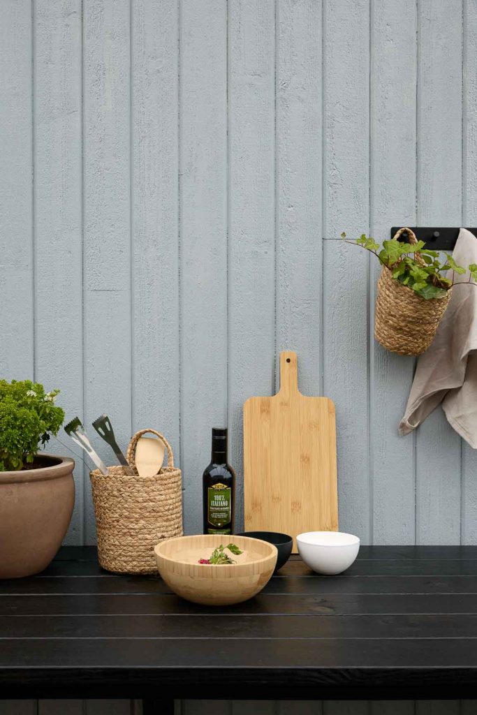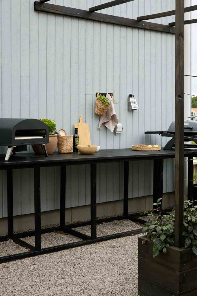 Utekjøkkenet har fått en lang benk og rikelig plass til å lage sommermat til mange utendørs!
