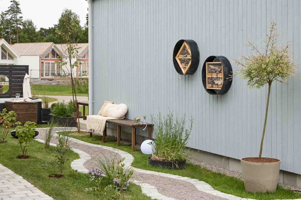 Jentene har en personlig stil i uterommet og har laget en vakker sti med myke, organiske former på siden av hytta. Uttrykket gir japanske vibber, med en skandinavisk touch.