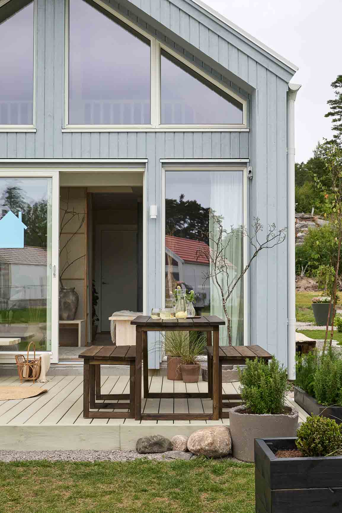Hytta er malt med DRYGOLIN Power Clean i fargen Jotun 5556 Nordic Blue. Møblene er beiset med TREBITT Terrassebeis 9052 Eksotisk Tre