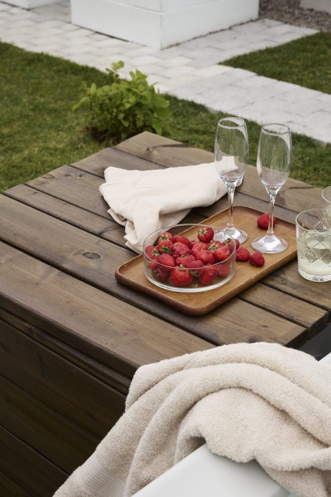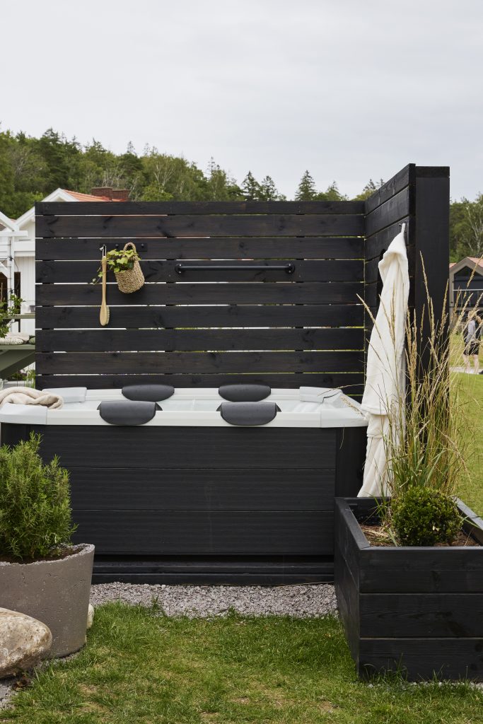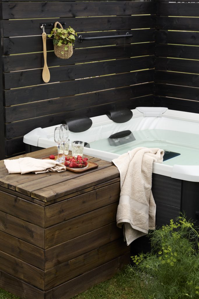 Bak leveggen skjuler det seg et deilig boblebad – et privat mini-spa! Her er det bare å nyte ferielivet på hytta. Bord: TREBITT Terrassebeis 9052 Eksotisk Tre