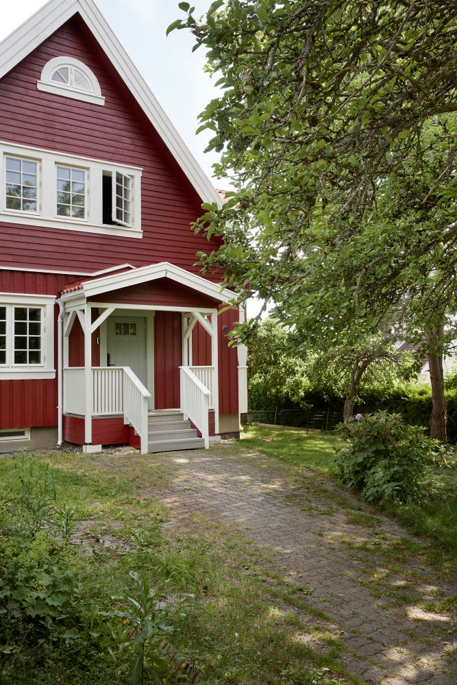 Dette huset er et flott eksempel på hvordan du kan bruke farger for å skape helhet og balanse. Tradisjon møter nåtid ved å kombinere den klassiske rødfargen med moderne og dempede detaljer.