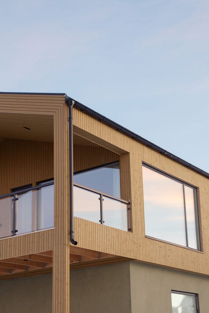 Dette moderne huset er beiset i den grålige, men gylne okertonen TREBITT 90032 Grånet Oker. Denne oljebeisfargen er lys og lekker, og er inspirert av naturlig treverk. Den er nydelig i kombinasjon med JOTUN DryTech Murmaling 8046 Twig Brown på muren.
