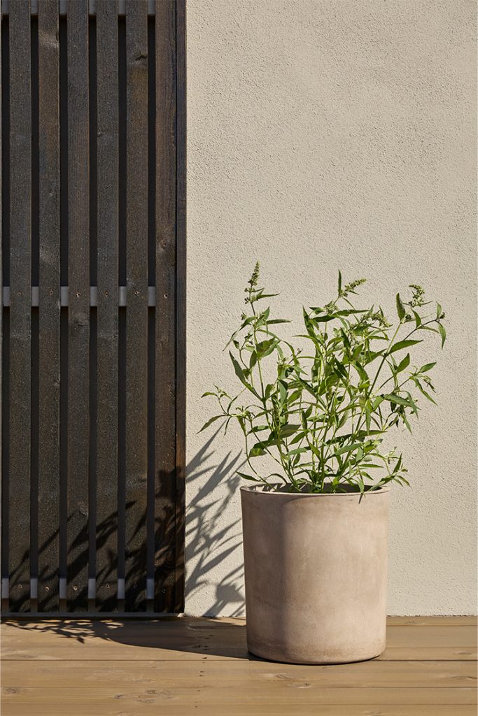 Detalj mørkebrun spilevegg og malt mur med grønn plante i terracottakrukke foran. Vegg: TREBITT_0675-Seterbrun_Mur-1491-Slipestein_Terrasse-90028-Skyggebrun