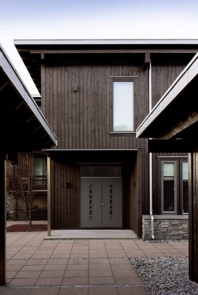 Her er det benyttet både liggende og stående kledning, der den stående er malt med DRYGOLIN Nordic Extreme Supermatt i Jotun-fargen 9938 Dempet Sort og den liggende kledningen er beiset i fargen TREBITT 9054  Naturlig Eldet.